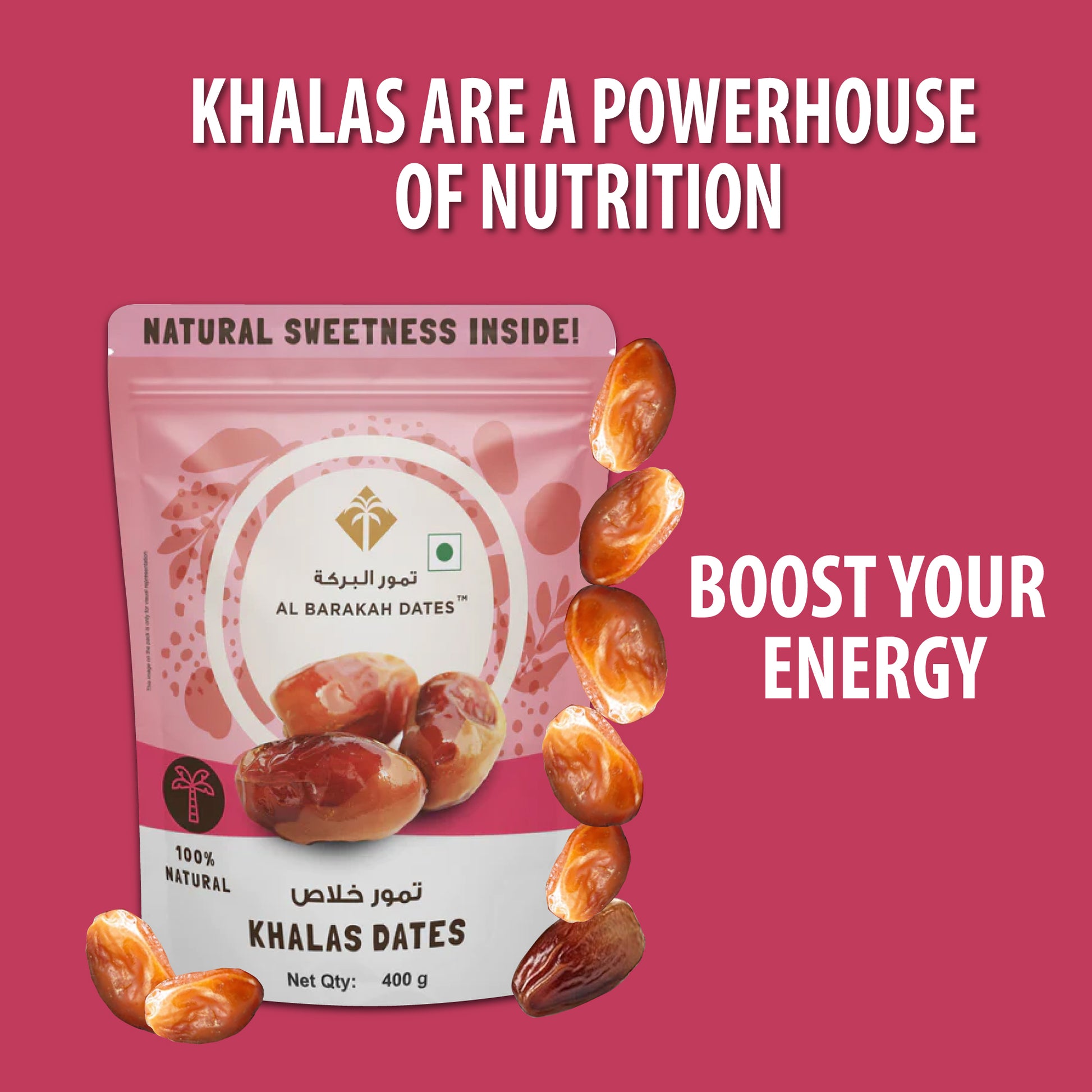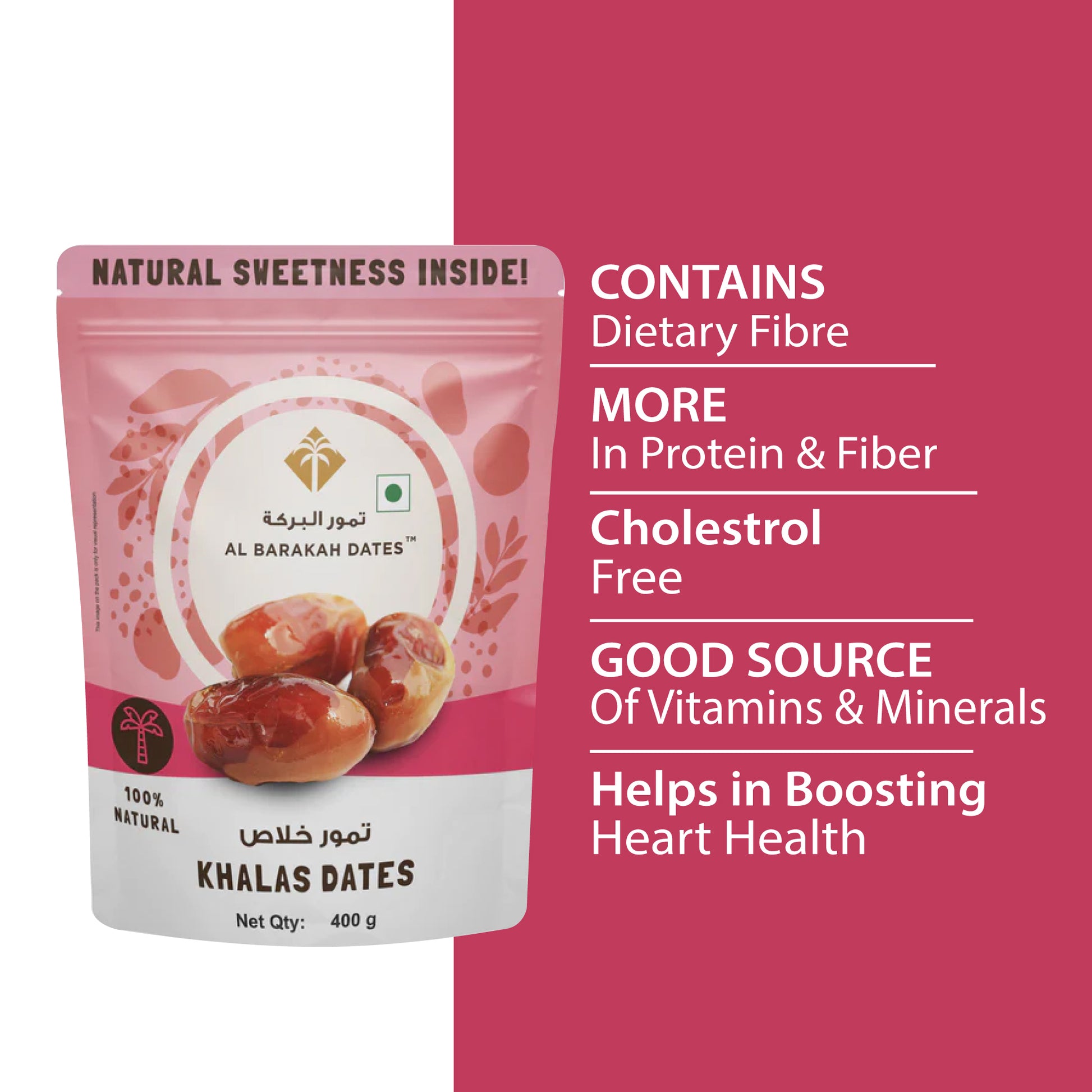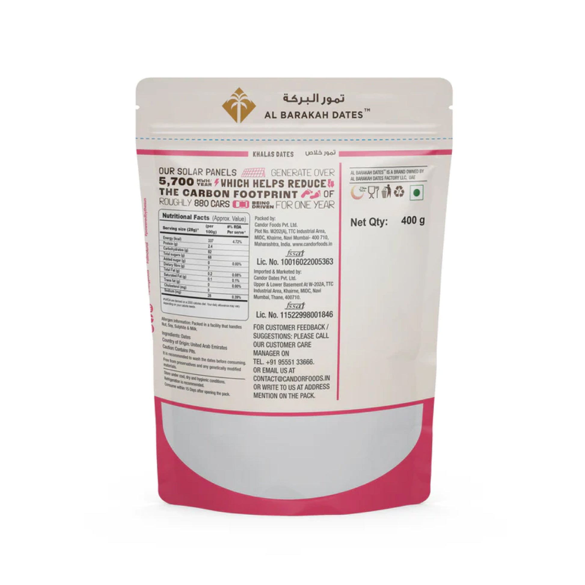 Al Barakah Khalas Dates 400g | Delicious and Nutritious Khajur/Khajoor Dryfruit | 100% Natural | No Added preservatives | Vegan | No added Sugar