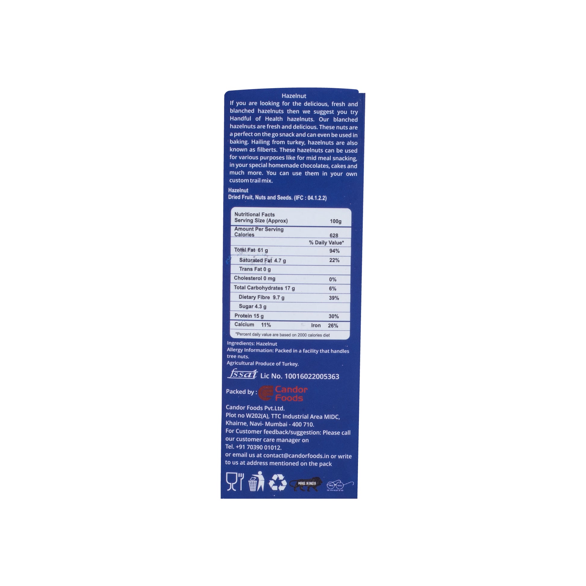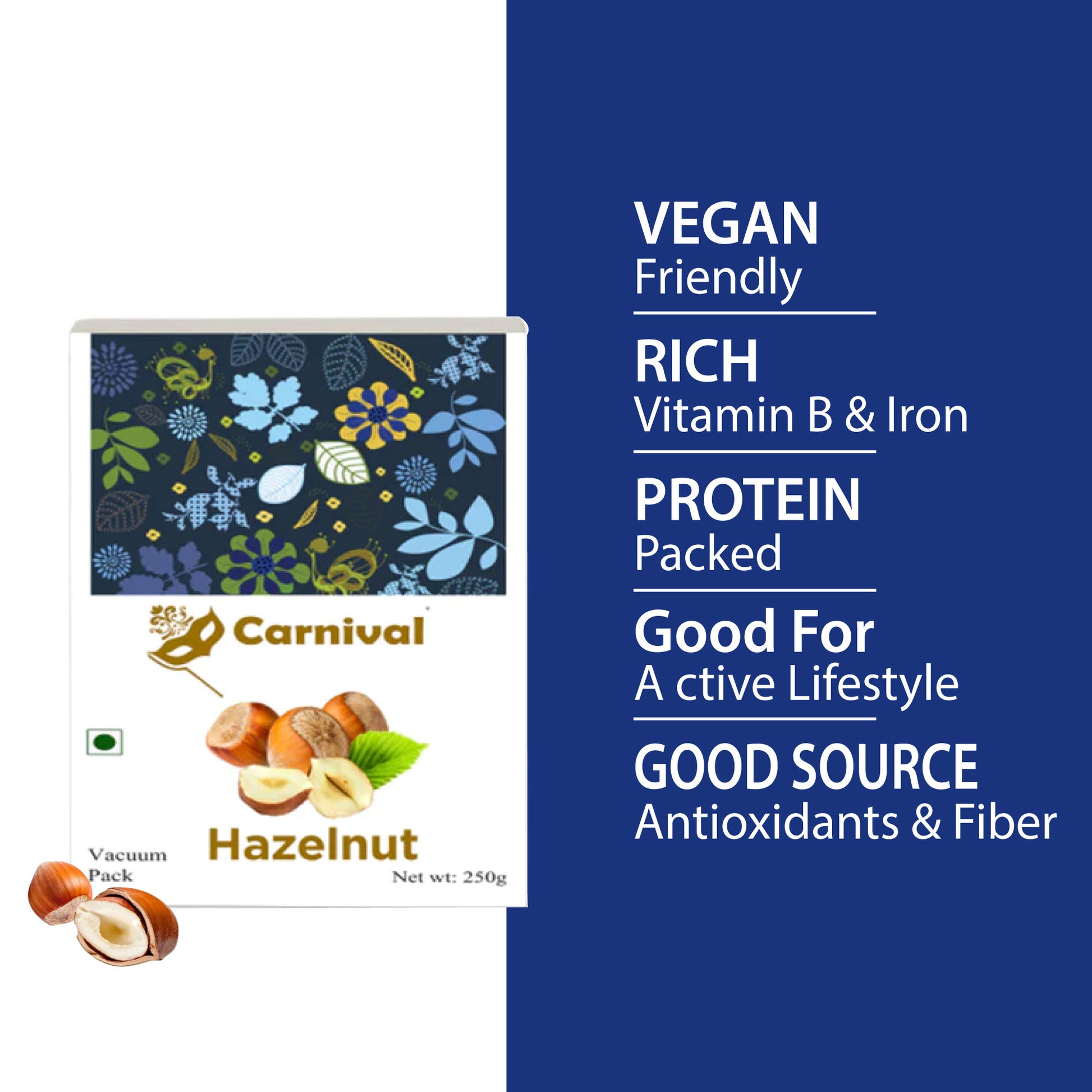 Storage instruction: Hazelnuts should be stored in a cool, dry place, away from direct sunlight. They can be stored in an airtight container in the refrigerator or freezer to extend their shelf life.