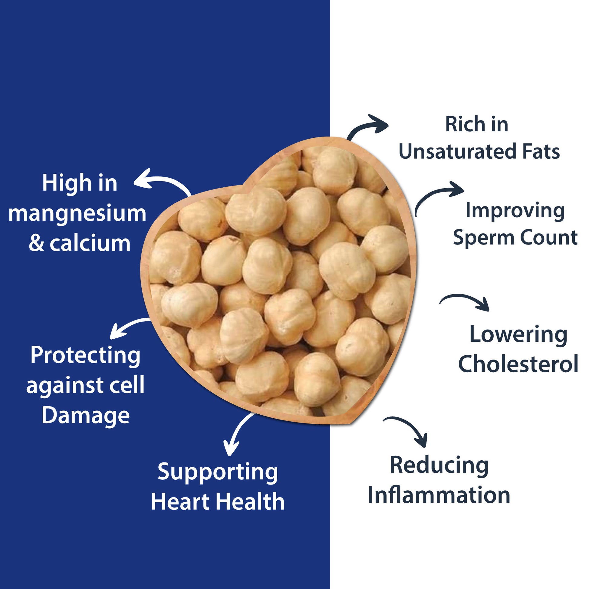 Nutrition benefits: Hazelnuts are an excellent source of healthy fats, fiber, and protein. They are also rich in antioxidants, vitamins, and minerals like vitamin E, magnesium, and copper, which provide numerous health benefits like reducing inflammation, improving heart health, and lowering blood sugar levels.